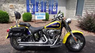 2004 Fat Boy 88ci FI 5 speed. One owner this is loaded with factory accessories; Wheels, Saddlebags, sissy bar, fork covers, floorboards, Stage one kit with Screamin Eagle exhaust. Paint has a nice pearl in it, Blue Ridge Riders
